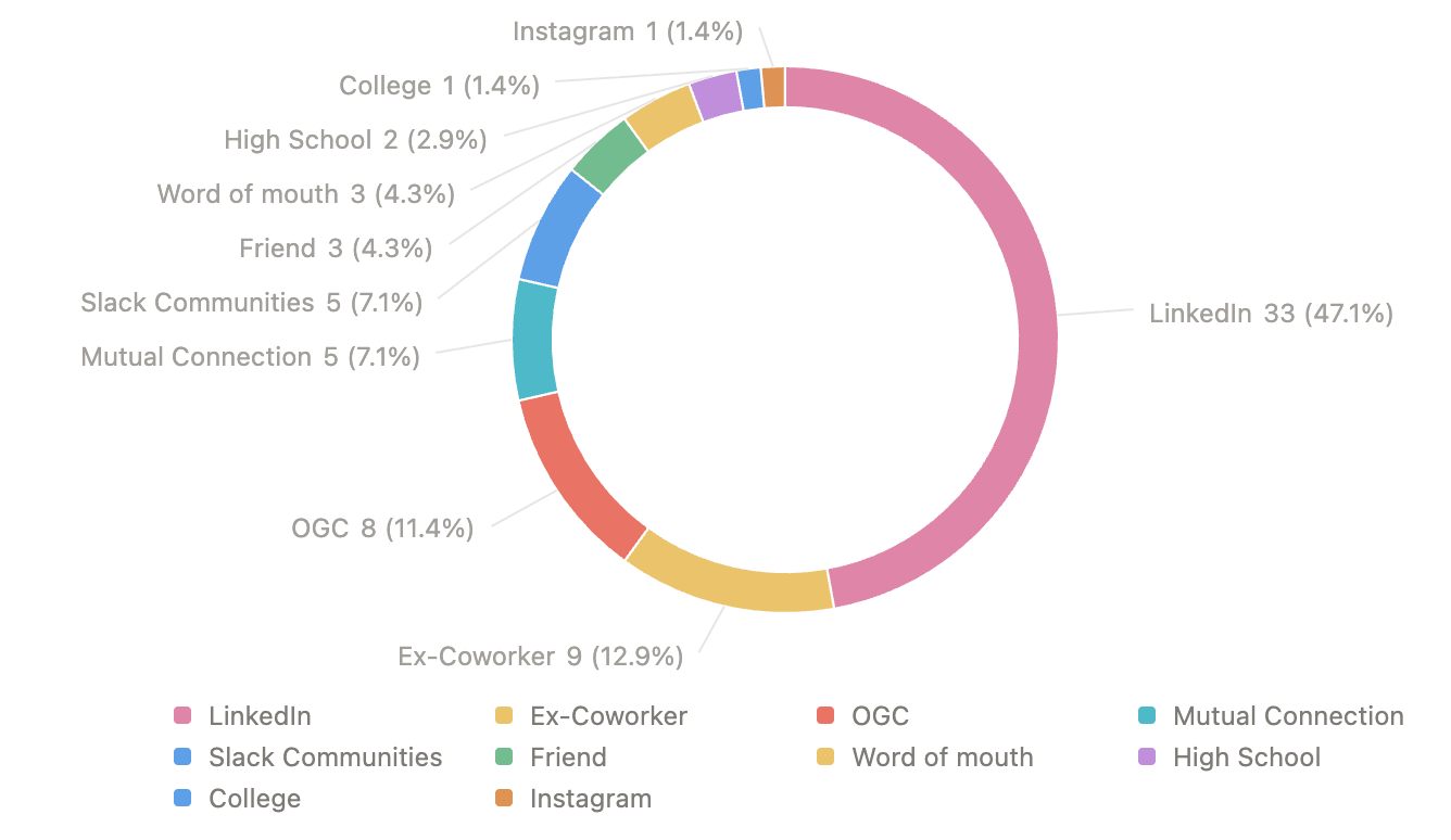 The second biggest bucket is people from my existing network: mutual connections, people I went to high school or college with, former colleagues. What surprised me is how many of them reached out because something I shared online resonated with them. It wasn't the relationship alone—it was because I was sharing consistently.